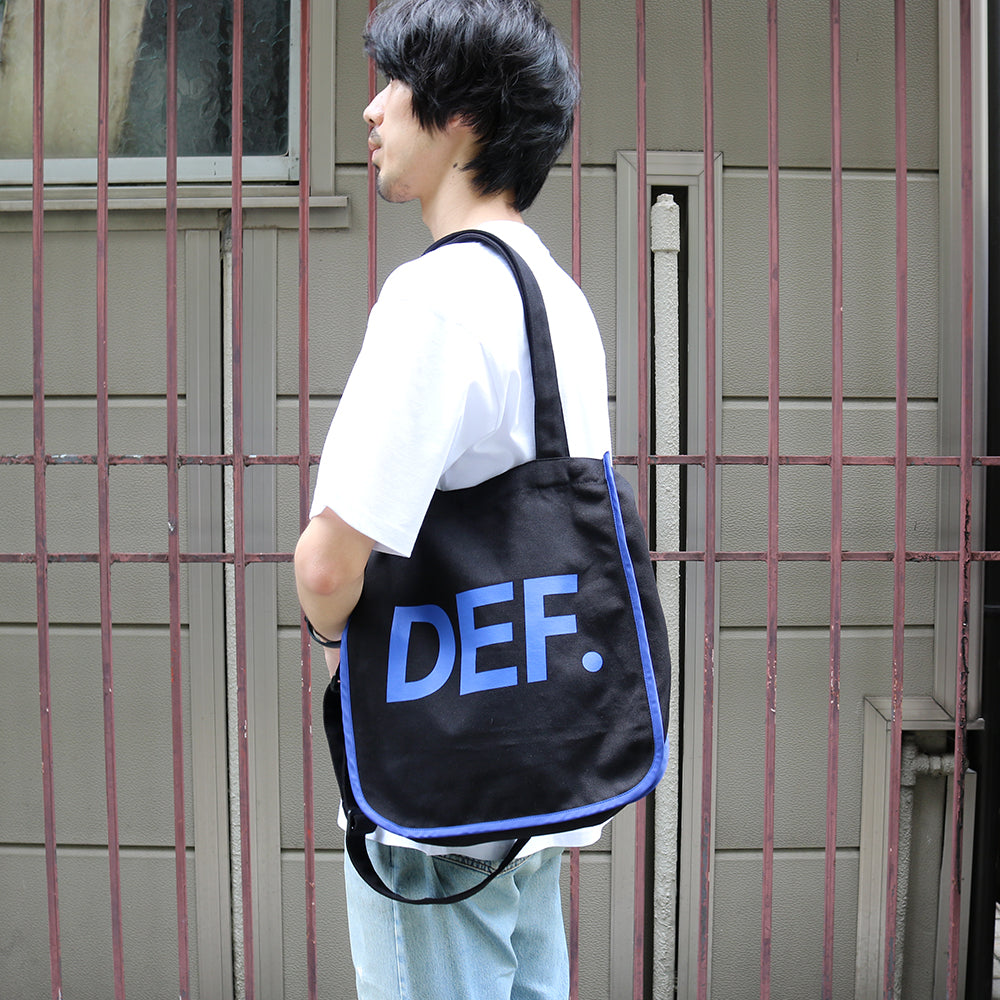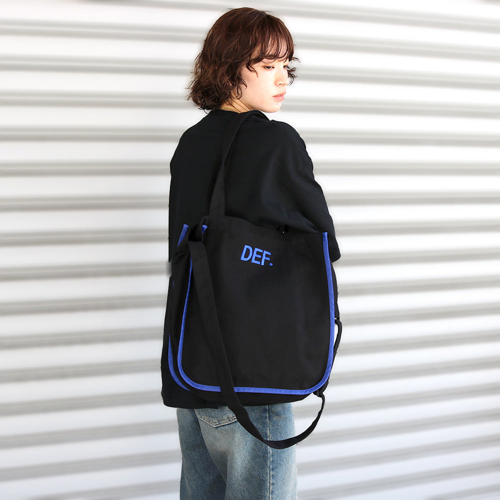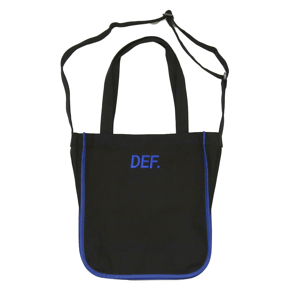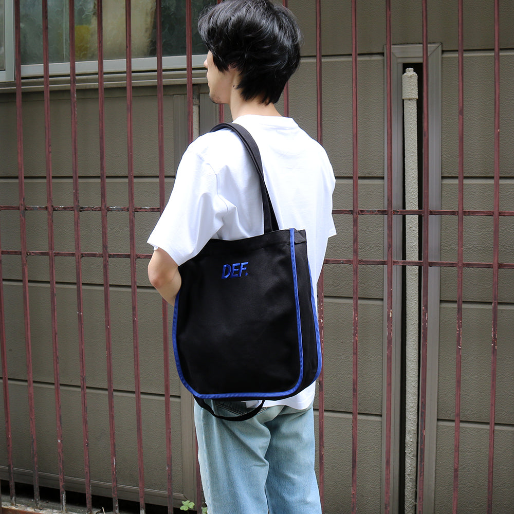 コットンキャンバスを使用した2wayトートバッグです。コットンキャンバスは中肉厚で薄くもなく厚くもなく程よい厚さです。トートバッグとショルダーバッグの2ウェイで使えます。ショルダーは使わない時はバッグの中に仕舞えます。DEF.ロゴをロイヤルブルーで片面にプリント、片面に刺繍で施しています。また、ロイヤルブルーのナイロン生地でパイピングを施しているのもポイントです。バッグの中は片面にポケットが1つ付いています。鞄口にはドット釦が3つ付いていて開閉出来る仕様です。