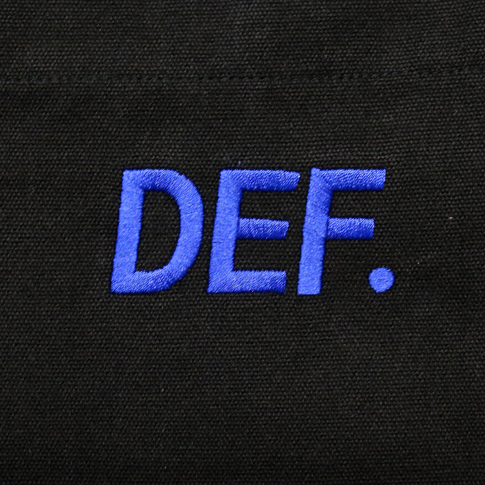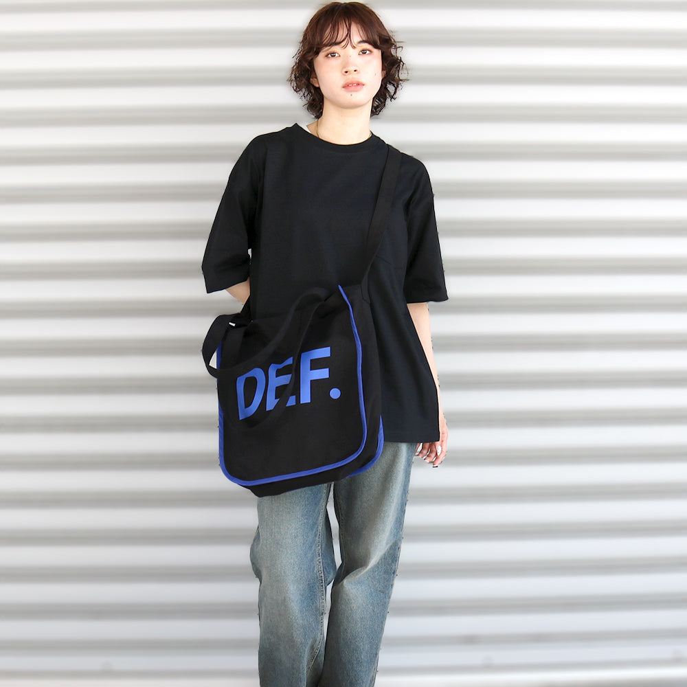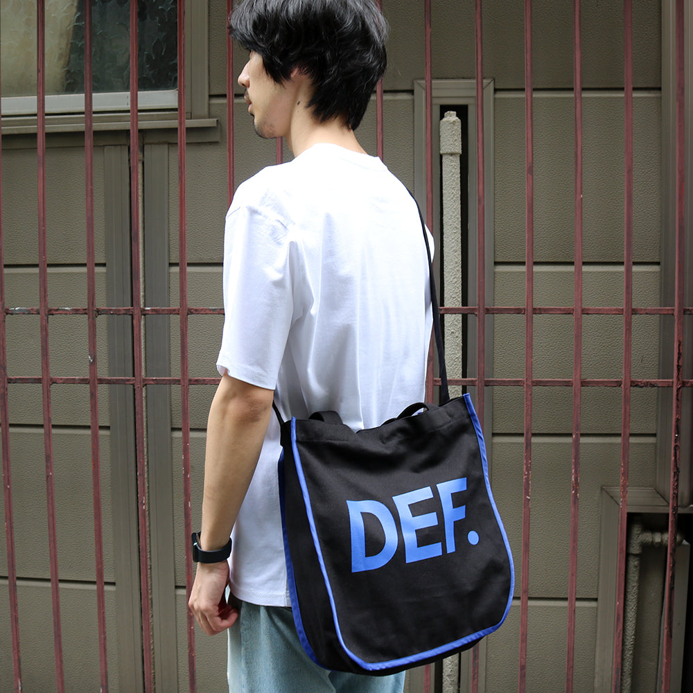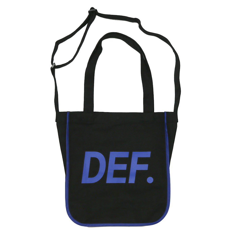 コットンキャンバスを使用した2wayトートバッグです。コットンキャンバスは中肉厚で薄くもなく厚くもなく程よい厚さです。トートバッグとショルダーバッグの2ウェイで使えます。ショルダーは使わない時はバッグの中に仕舞えます。DEF.ロゴをロイヤルブルーで片面にプリント、片面に刺繍で施しています。また、ロイヤルブルーのナイロン生地でパイピングを施しているのもポイントです。バッグの中は片面にポケットが1つ付いています。鞄口にはドット釦が3つ付いていて開閉出来る仕様です。