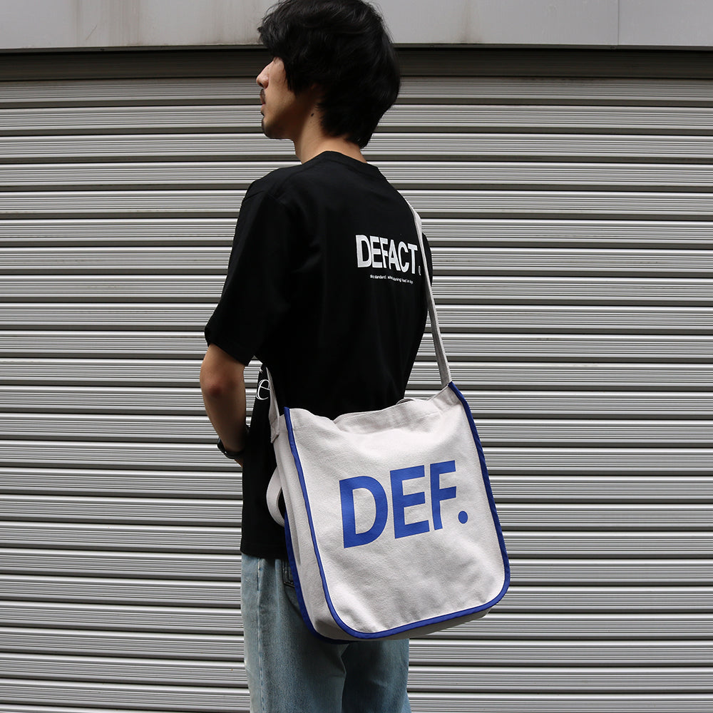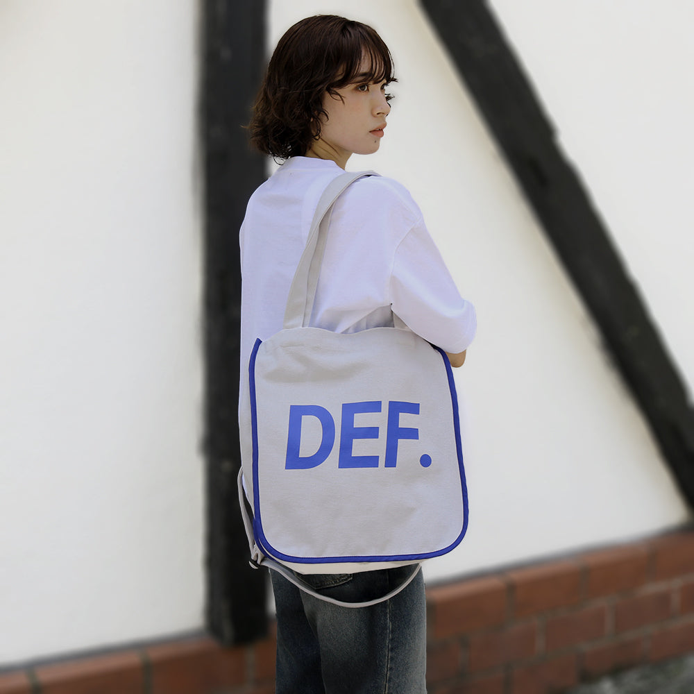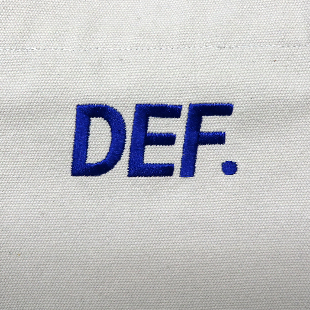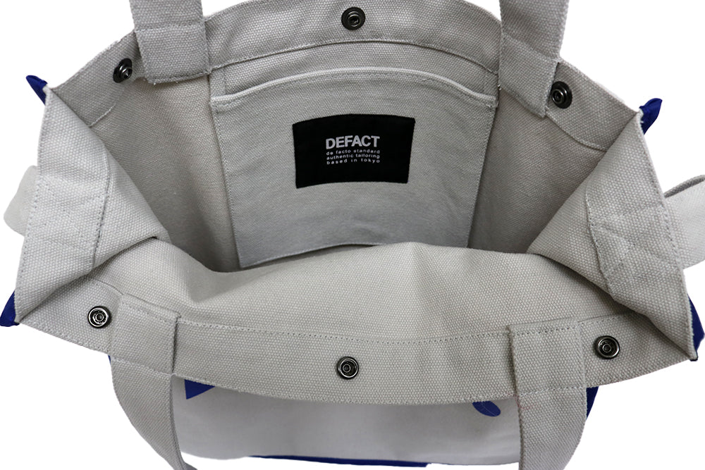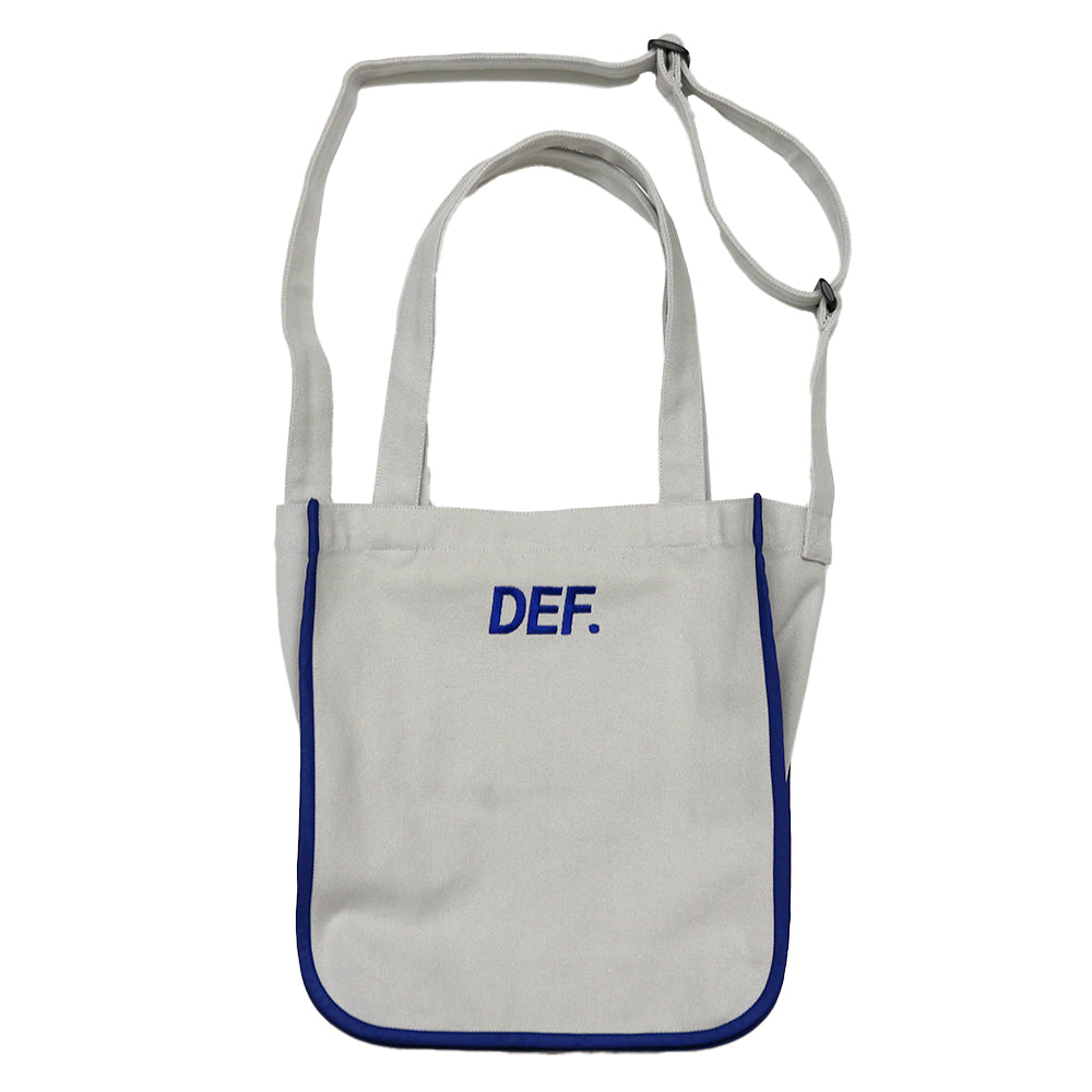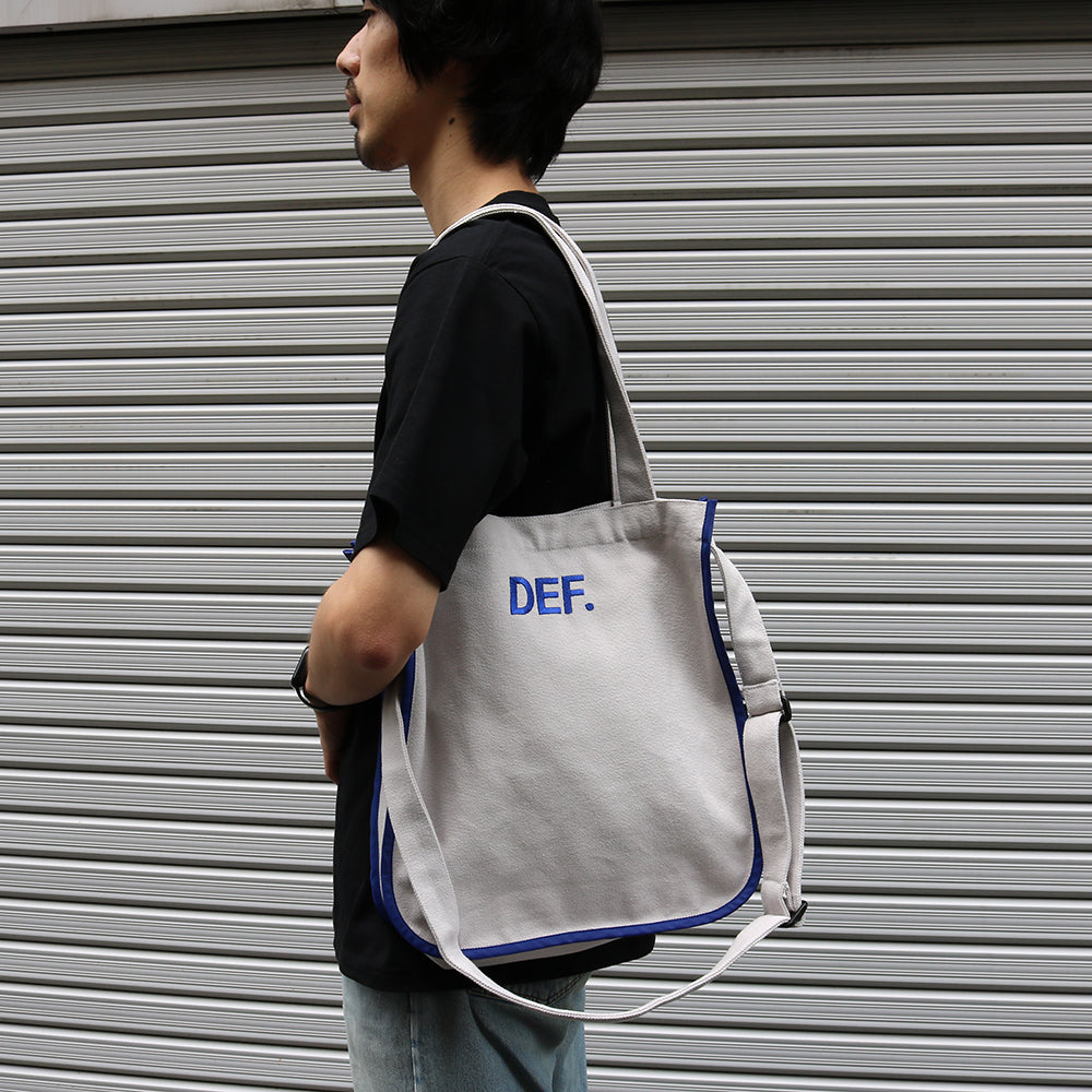 コットンキャンバスを使用した2wayトートバッグです。コットンキャンバスは中肉厚で薄くもなく厚くもなく程よい厚さです。トートバッグとショルダーバッグの2ウェイで使えます。ショルダーは使わない時はバッグの中に仕舞えます。DEF.ロゴをロイヤルブルーで片面にプリント、片面に刺繍で施しています。また、ロイヤルブルーのナイロン生地でパイピングを施しているのもポイントです。バッグの中は片面にポケットが1つ付いています。鞄口にはドット釦が3つ付いていて開閉出来る仕様です。