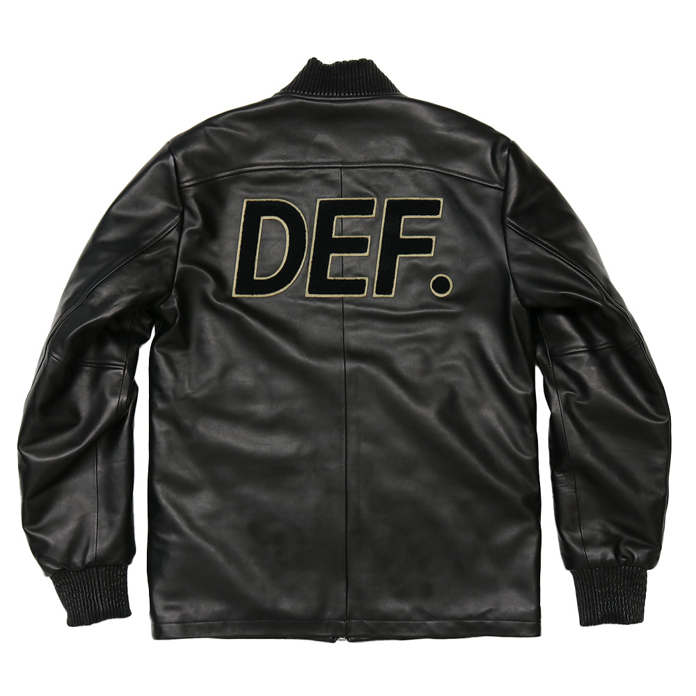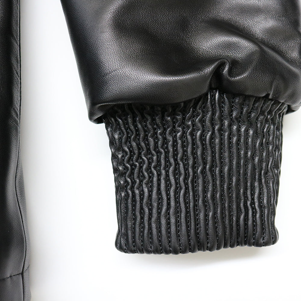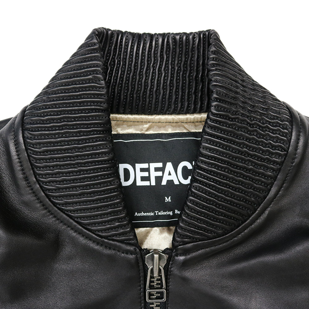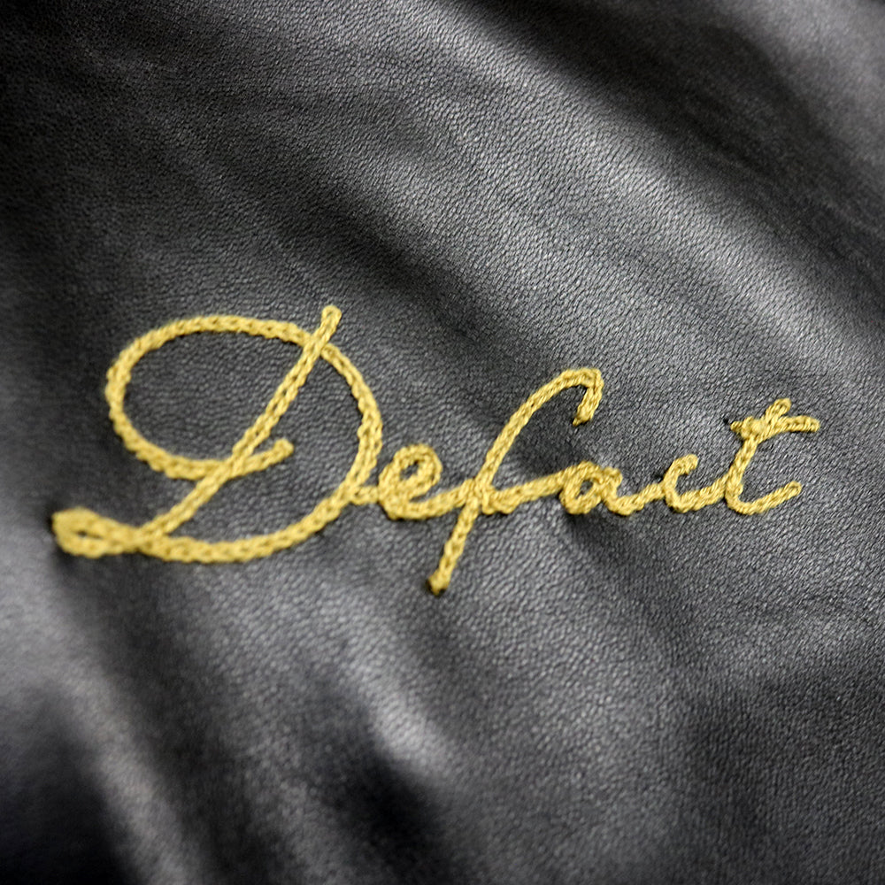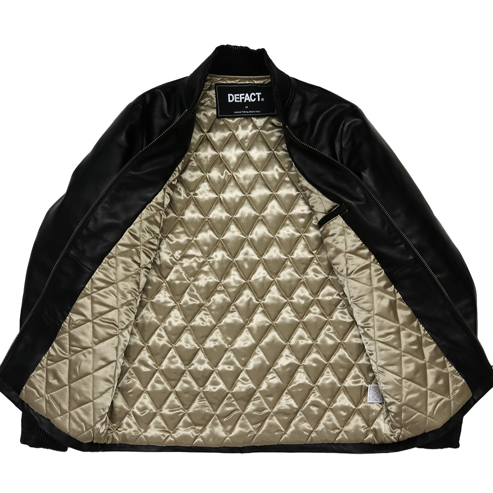 上質なラムレザーにこだわったレザージャケットです。衿と袖口リブも全てレザーで作成しています。裏地は光沢のあるサテン生地に中綿を入れてダイヤキルトを施し、レザーの防風性とキルティングの保温性を備えた1枚です。左胸にチェーンステッチ刺繍、後身頃にはサガラ刺繍のワッペンを配しデファクトならではのアクセントになっています。前端のYKKファスナーは8号サイズの太めのファスナーを採用しシンプルなデザインのアクセントになっています。秋は薄手のインナーに軽く羽織って、冬はスウェットを着ても十分ゆったりと羽織れるサイズ感になっています。
