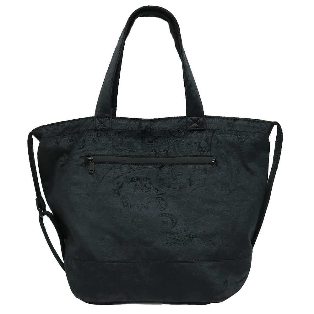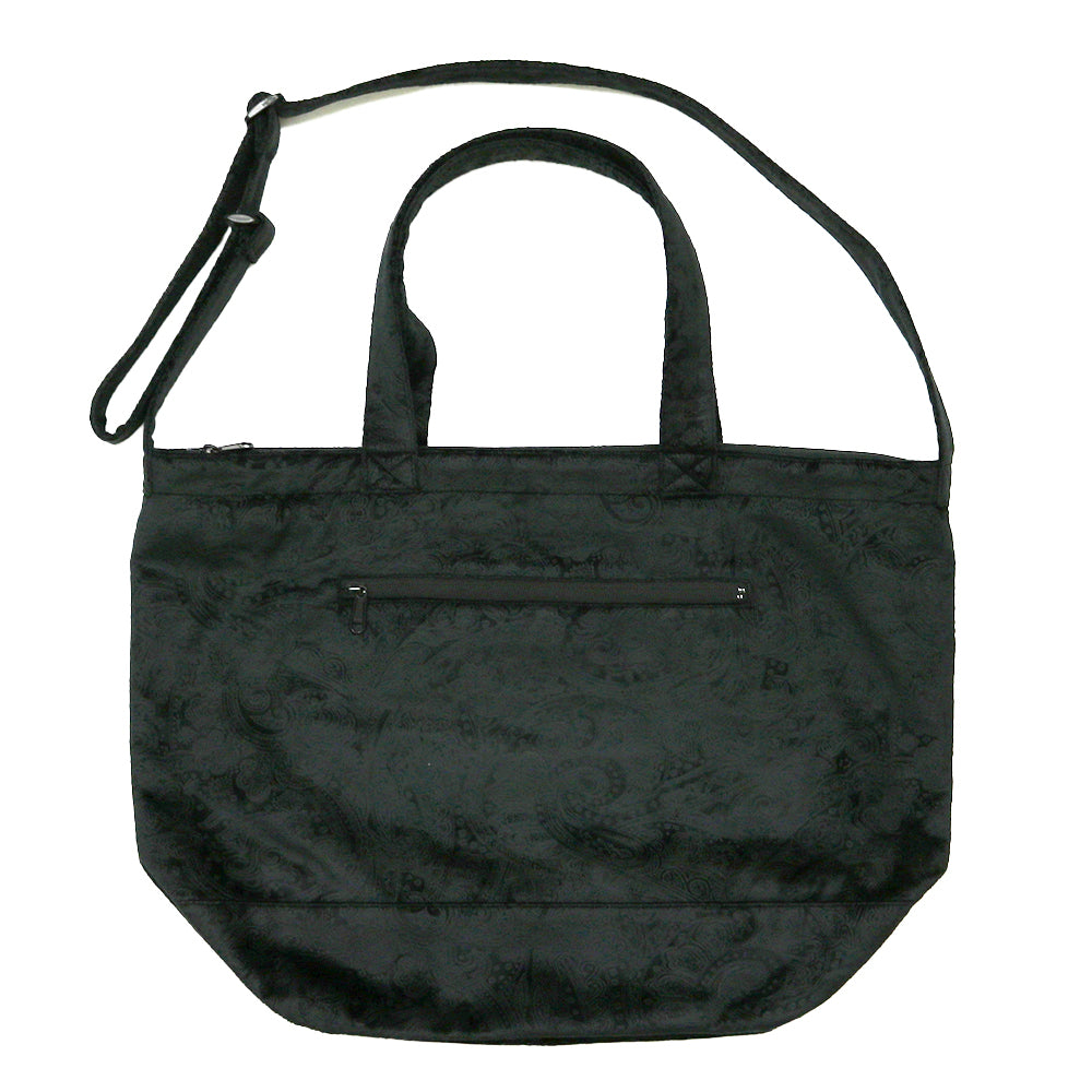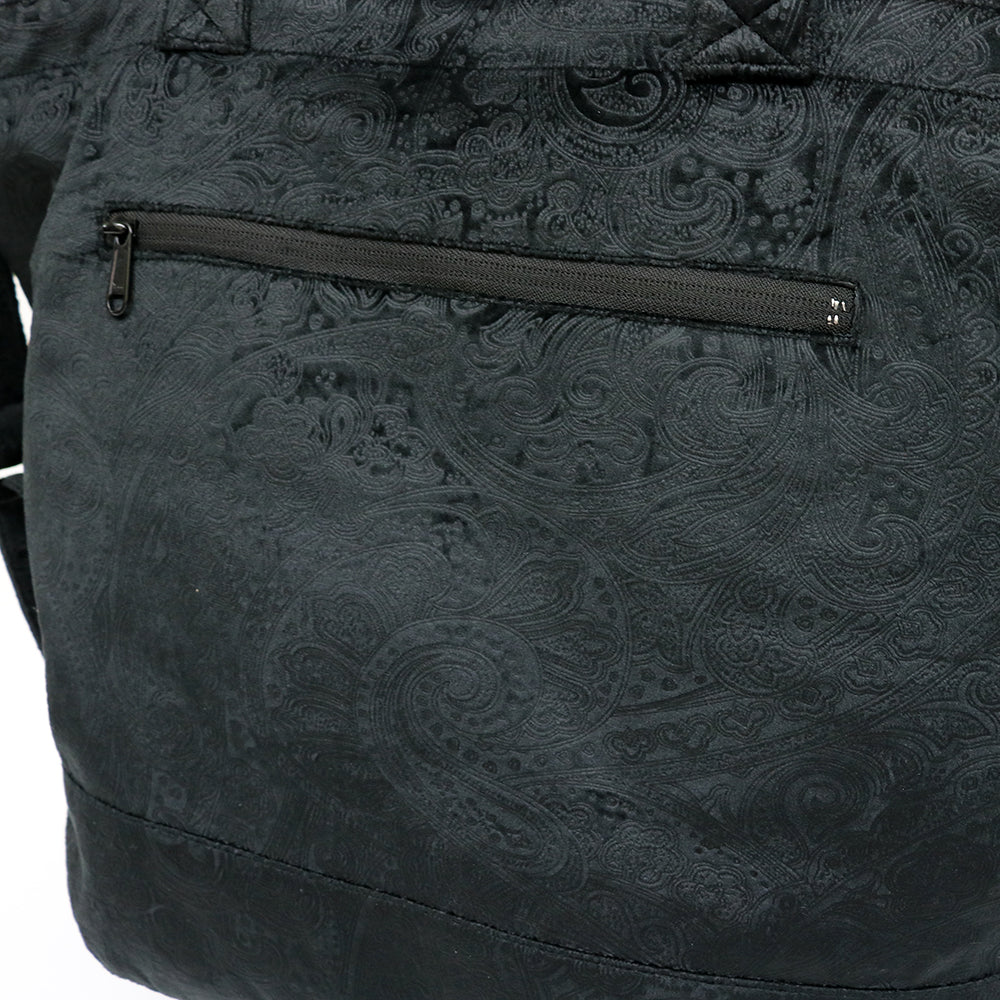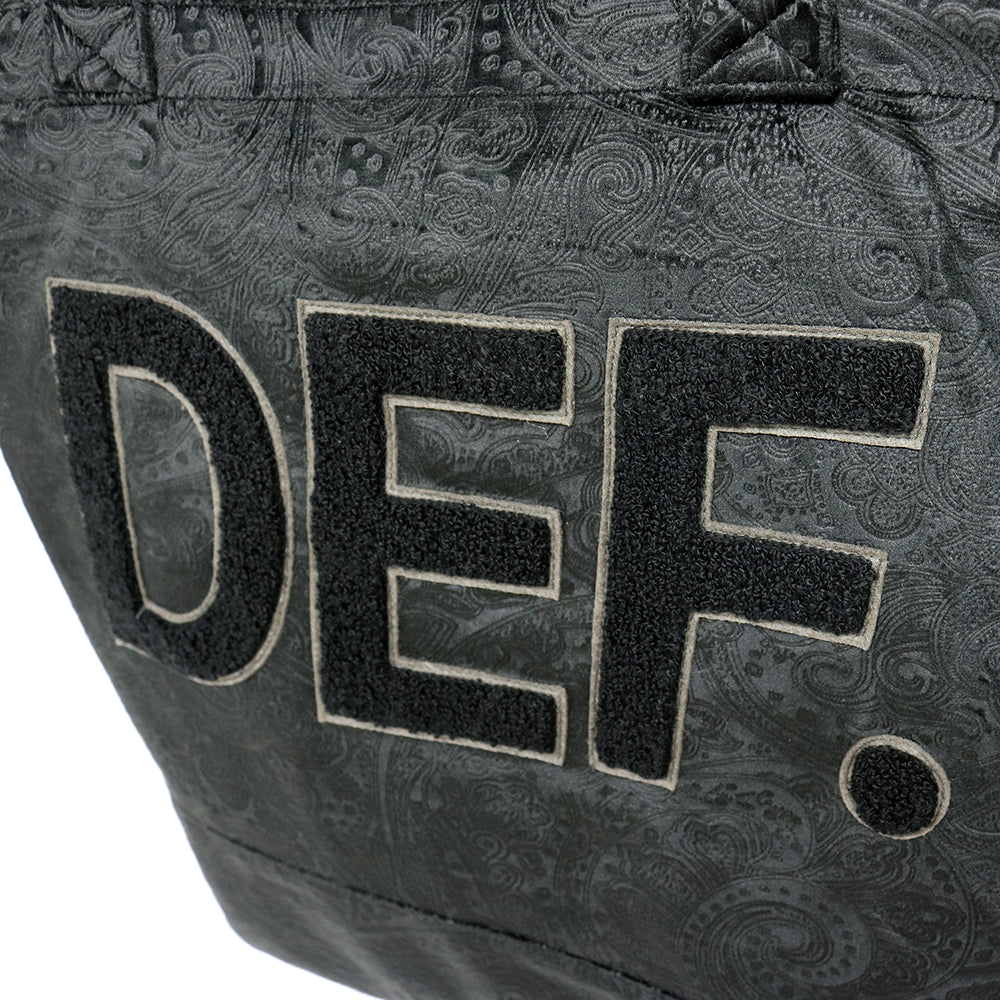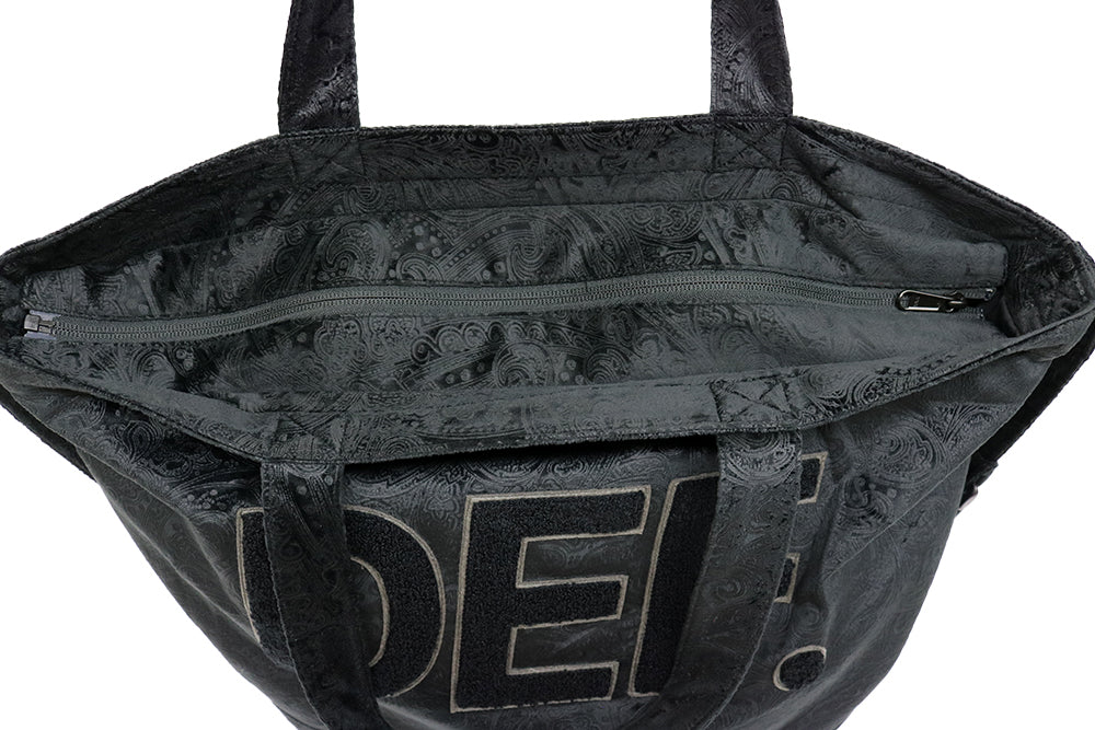 ベロアの少し起毛した特性を活かし型押しでペイズリー柄を表現した立体感のある生地を使用しています。2wayトートバッグはDEFACT定番のパターンで作成しています。ベロア生地は柔らかいため硬めの芯地を合わせ、バッグとして使用するのに程よい張り感を出しています。鞄口はファスナーで開閉できる仕様です。トートバッグとショルダーバッグの2ウェイで使えます。ショルダーは使わない時はバッグの中に仕舞えます。表面のDEF.ロゴはサガラ刺繍ワッペンで縁取っていて、表面の片面はファスナー付きのポケットです。